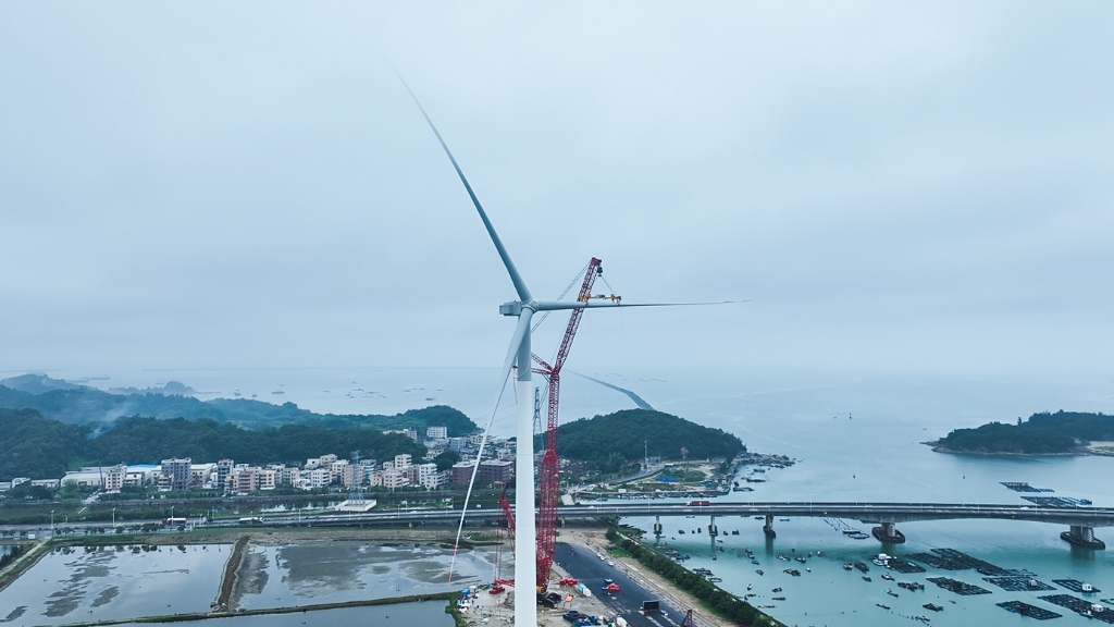 6月5日,18兆瓦半直驱大功率海上风电机组在广东省汕头市风电临海试验基地成功完成吊装。(人生就是博中国官网电气集团供图)